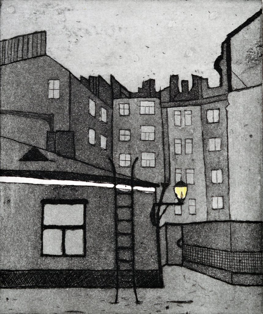Teen kaikki grafiikkatyöni syväpainomenetelmällä. Siinä viivat on kaiverrettu ja syövytetty laatan pintaan syvennyksiksi. Vedostaessa väri siirtyy näistä syvistä osista paperiin. Vedoksia teen yleensä noin 30 kpl/työ riippuen käytettävästä tekniikasta.